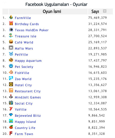 Texas holdem poker, bejewelet, farm ville, bubble island, slotomania, pyramid solitaire, zuma blitz, song pop, okey, tavla, simcity social, fruit ninja frenzy ve daha adını sayamadığım yüzlerce oyun... Hepsi harika, hepsi çok güzel, hepsi çok ince hesaplarla tasarlanmış 1 ve 0'ların ahenkle bir araya geldiği oyunlar.